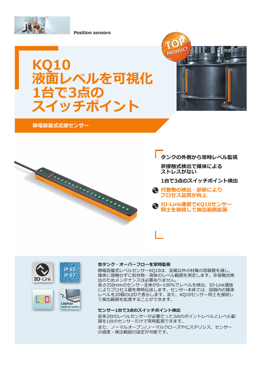 ◆タンクの外側から常時レベル監視 ◆非接触式検出で媒体によるストレスがない ◆1台で3点のスイッチポイント検出 ◆付着物の検出・診断によりプロセス品質が向上 ◆IO-Link通信でKQ10センサー 同士を接続して検出範囲拡張 ...