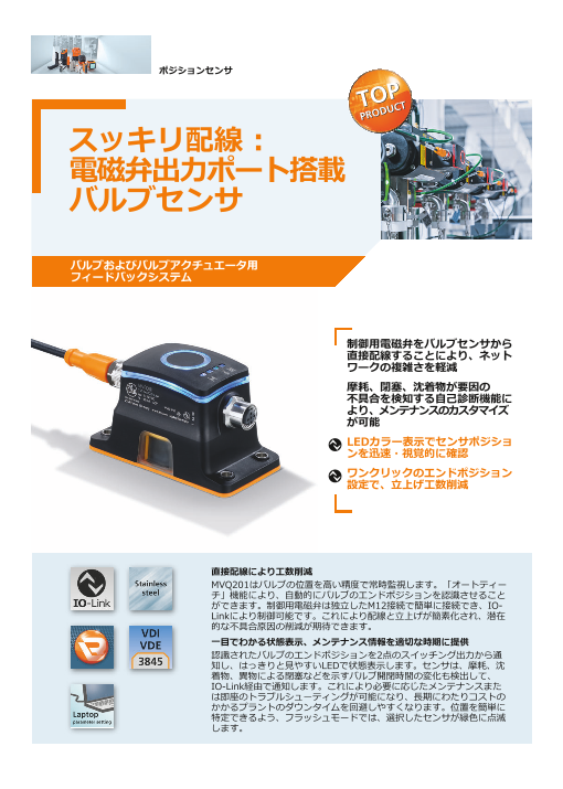 ◆制御用電磁弁をバルブセンサから直接配線することにより、ネットワークの複雑さを軽減 ◆摩耗、閉塞、沈着物が要因の 不具合を検知する自己診断機能に より、メンテナンスのカスタマイズが可能 ◆LEDカラー表示でセンサポジショ ンを迅速・視...