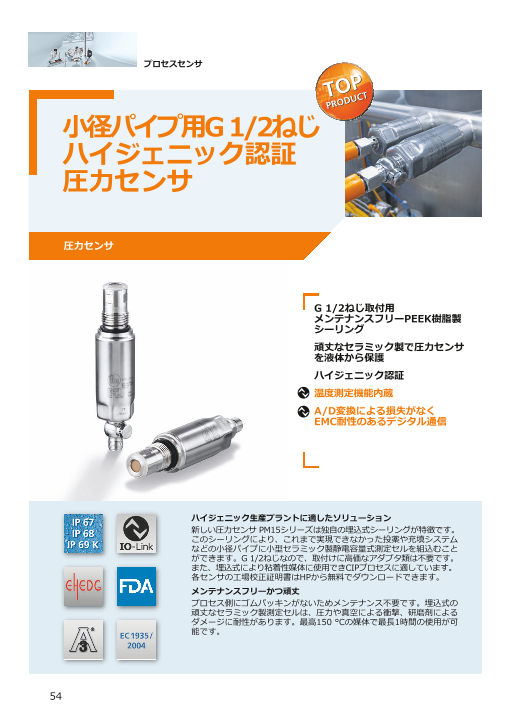 ◆G 1/2ねじ取付用 メンテナンスフリーPEEK樹脂製シーリング ◆頑丈なセラミック製で圧力センサを液体から保護 ◆ハイジェニック認証 ◆温度測定機能内蔵 ◆A/D変換による損失がなくEMC耐性のあるデジタル通信 ◆詳細はカタ...