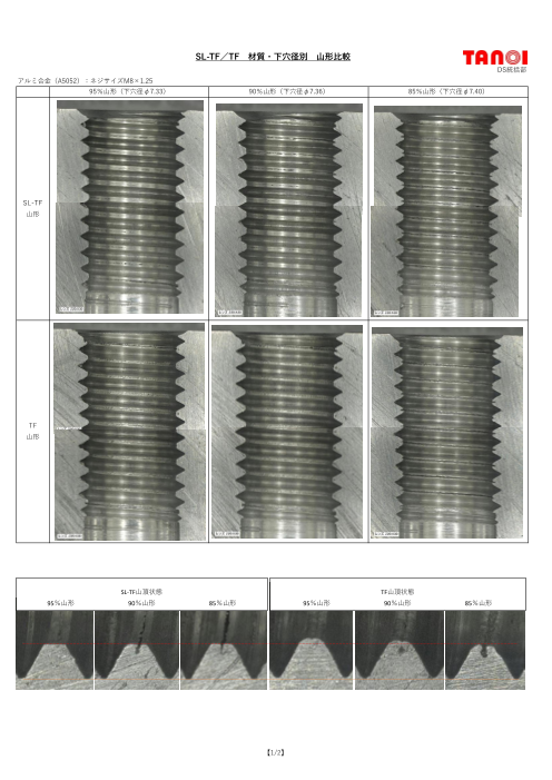 転造タップで加工されたメネジには、山頂にシーム(繋ぎ目)が形成されます。 材質別、下穴径別の山形状を比較しました。併せてシーム部を切除するシームレスタフレットで加工した山形状と比べてごらんください。