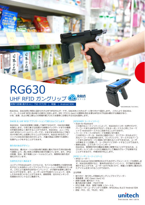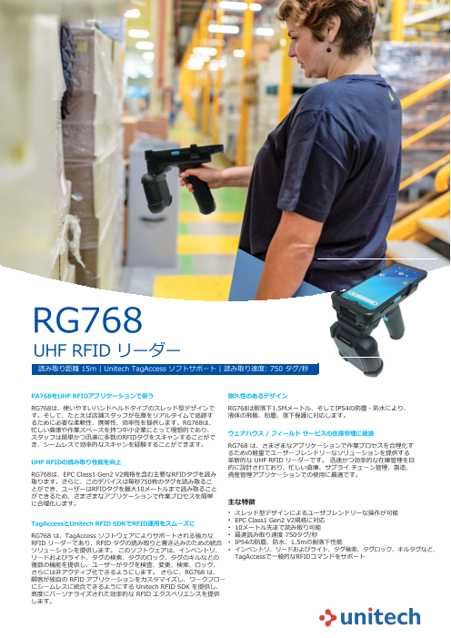 主な特徴 • スレッド型デザインによるユーザフレンドリーな操作が可能 • EPC Class1 Gen2 V2規格に対応 • 10メートル先まで読み取り可能 • 最速読み取り速度 750タグ/秒 • IP54の防塵、防水、1.5mの耐落下性能 ...