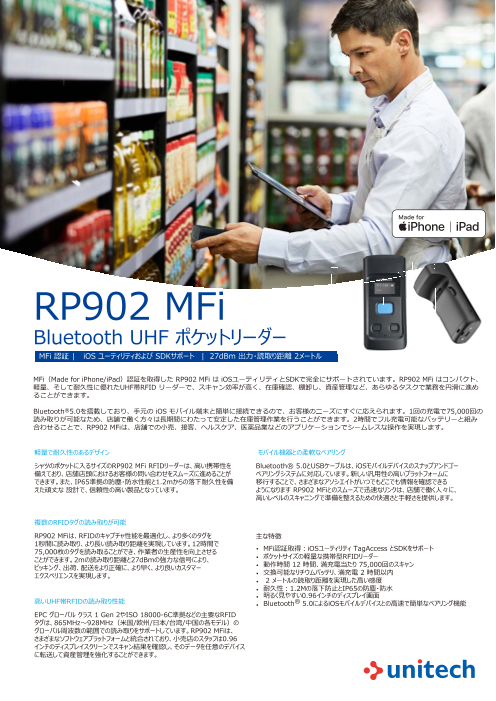 主な特徴 • MFi 認証取得 : iOS 専用アプリ(TagAccess)と SDK をサポート • ポケットサイズの軽量でポータブルなUHF RFIDリーダー • 一度の充電で、12時間以上の動作時間、最大75,000回のスキャンが可...