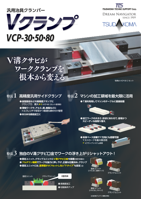 汎用冶具クランパー Vクランプのご紹介 機械のテーブルに直付けできる、クサビの効果を利用した引き込みタイプの汎用クランパーです。 高精度且つ幅広なプレートなどの加工に最適です。