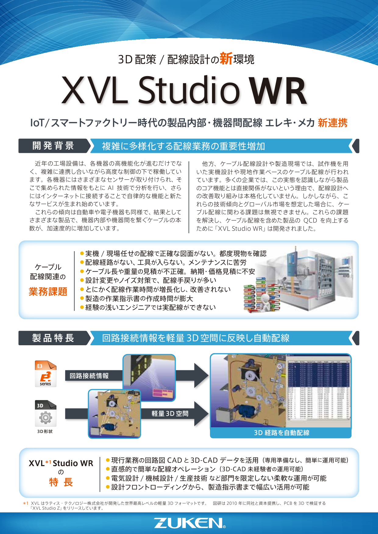 3D-CAD から配線対象のメカアセンブリのXVL を作成し、その上に回路CAD(E3.series)の接続情報を 反映することで、XVL Studio WR で配線設計が行えます。また、設計したケーブル配線データは、配線長一 覧や製造指示書で活用...