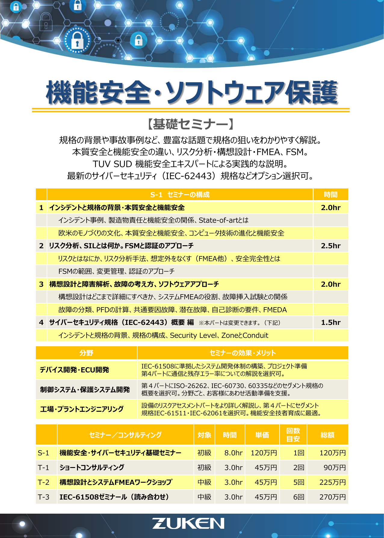 本質安全と機能安全の違い、リスク分析・構想設計・FMEA、FSM。 TUV SUD 機能安全エキスパートによる実践的な説明。 最新のサイバーセキュリティ(IEC-62443)規格などオプション選択可。