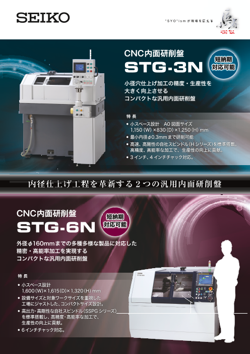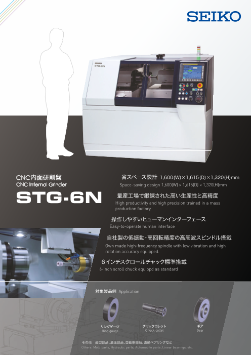 今回発表するSTG-6Nはジャストサイズのコンセプトはそのまま、 ”もう少し大きなワークを削ることができる設備が欲しい”という お客様のご要望に応える6インチチャック搭載の内面研削盤です。 機械幅2,000mmを超える設備が多い中、機械幅1,600...