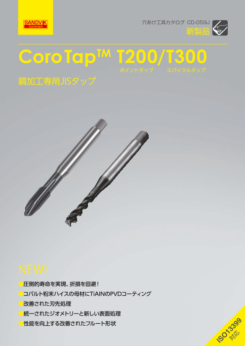 ●高い切削速度と長い工具寿命で圧倒的工具寿命を実現、折損を回避! ●各被削材に適応したジオメトリーおよび刃先処理でそれぞれの被削材で最高の性能を発揮 ●ストレートタップCoroTap™100、ポイントタップCoroTap™200、スパイラルタップCo...