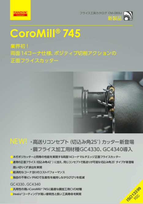 高送りコンセプト(切込み角25°)カッター新登場 鋼フライス加工用材種GC4330、GC4340導入 ◆ネガポジカッターと同等の性能を実現する両面14コーナマルチエッジ正面フライスカッター ◆通常の正面フライス(切込み角42°)に加え...
