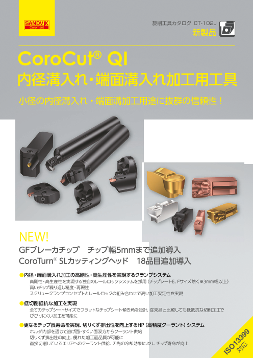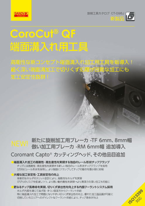 新たに旋削加工用ブレーカ -TF 6mm、8mm幅、倣い加工用ブレーカ -RM 6mm幅 追加導入 Coromant Capto カッティングヘッド、その他品目追加 ◆端面溝入れ加工の高剛性・高生産性を実現する独自のレール形状チップクラ...