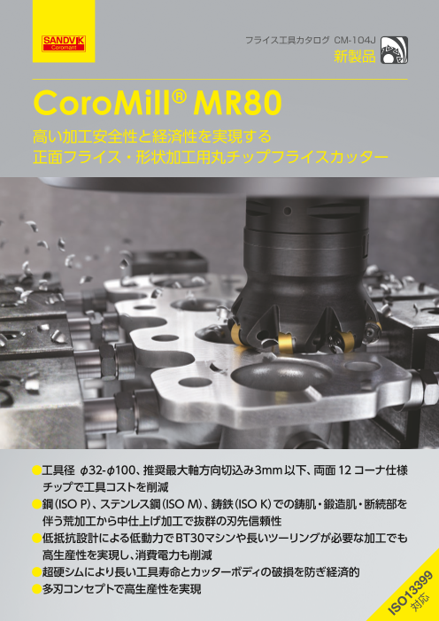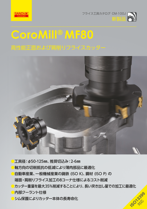 高性能正面および肩削りフライスカッター CoroMill® MF80は下記のような特長があります。 ●工具径:φ63-125㎜、推奨切込み:2-6㎜ ●軸方向の切削抵抗の低減により薄肉部品に最適化 ●自動車産業、一般機械産業の鋳鉄 (ISO K)、...