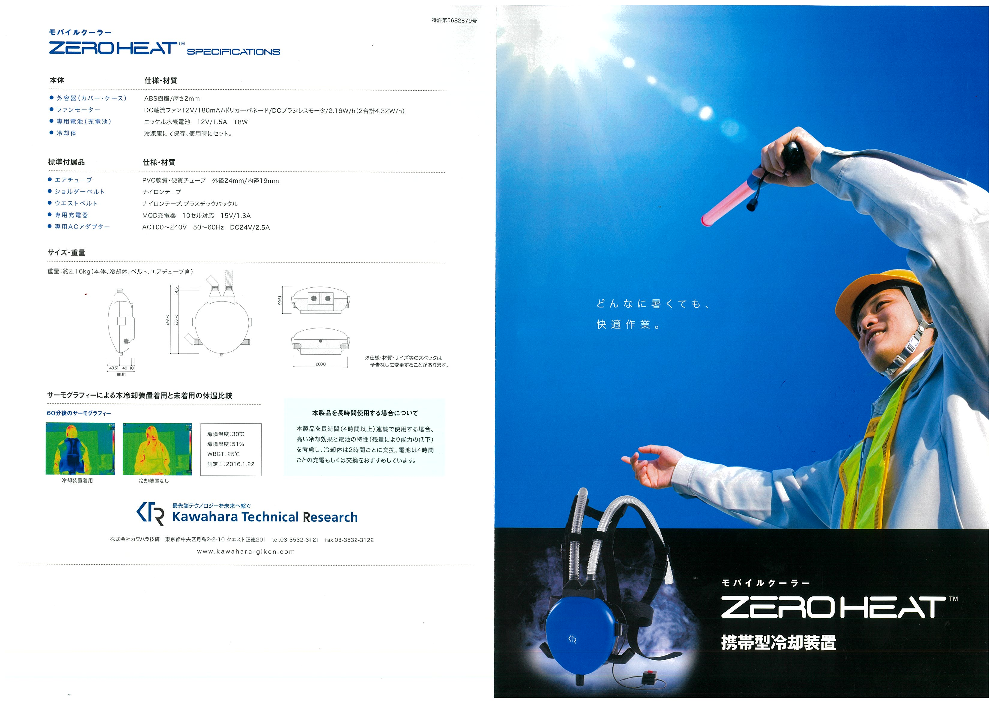 『ZEROHEAT』は、ヒートストレスを解消できる小型・軽量のモバイルクーラーです。 服と体表面との空間で冷気を循環させ、体表面を冷却。 夏季における熱中症対策はもちろん、さまざまな環境下での ヒートストレスによる体力低下や作業力低下を緩和...