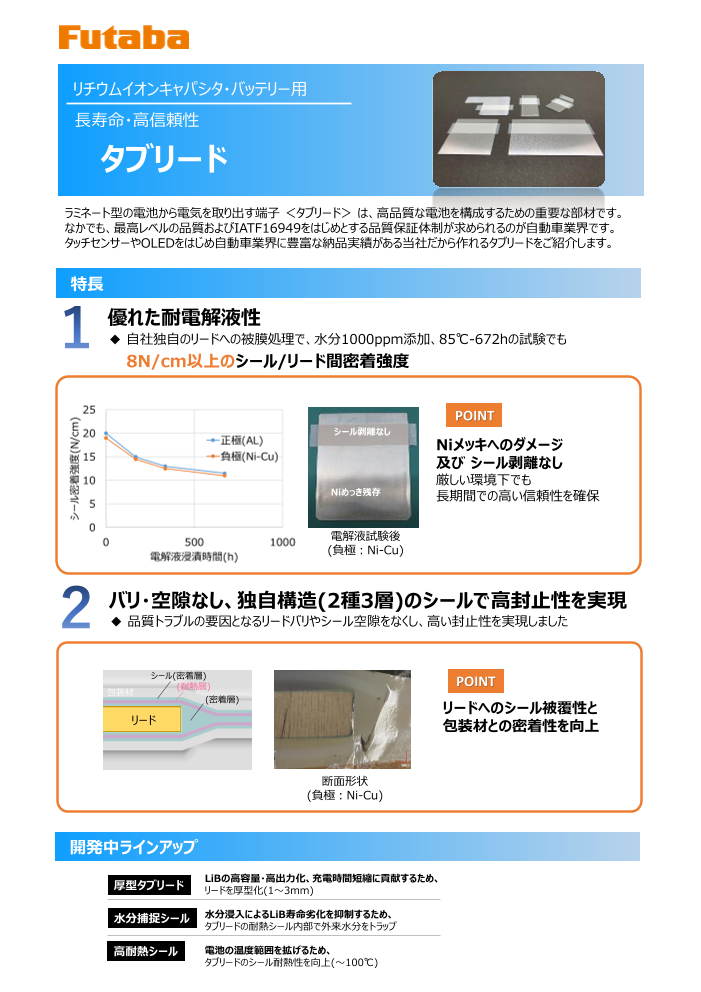 双葉製タブリードの特長、カスタム対応の仕様、信頼性試験データなどをご紹介します。より詳しいご説明、サンプルのご用命、お見積り依頼などがございましたら、お気軽にお問い合わせください。