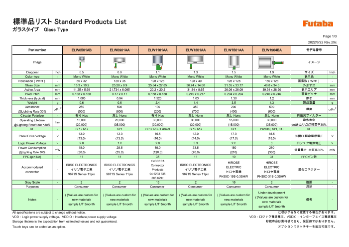 双葉製の標準品OLEDの一覧表です。標準品のため、小ロット・短納期対応も可能です。詳しいご説明、デモ機やサンプルのご用命、お見積り依頼など、お気軽にお問い合わせください。