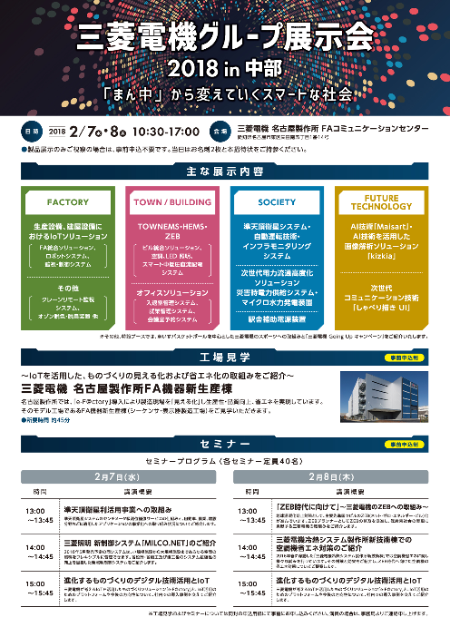 ◆日時 2018 2/7(水)・8 10:30-17:00 ◆会場 三菱電機名古屋製作所 FAコミュニケーションセンター ◆主な展示内容 ・生産設備、建築設備におけるIOTソリューション ・TOWNEMS-HEMS・ZEB ・準天頂星...