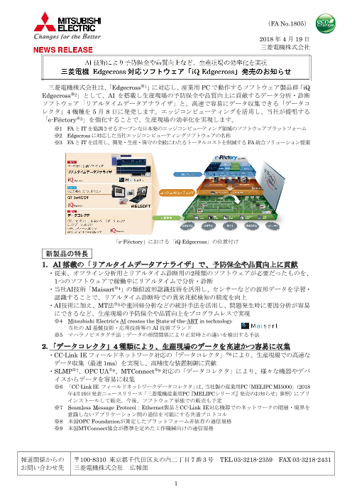 三菱電機株式会社は、「Edgecross」に対応し、産業用 PC で動作するソフトウェア製品群「iQ Edgecross」として、AI を搭載し生産現場の予防保全や品質向上に貢献するデータ分析・診断ソフトウェア「リアルタイムデータアナライザ」と、高速で容...