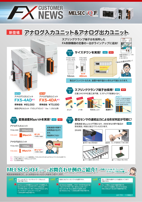 アナログ入力ユニットFX5-4AD アナログ出力ユニットFX5-4DA 【特徴】 ◆サイズダウンを実現 ◆スプリングクランプ端子台採用! ◆変換速度80µs/chを実現! ◆変位センサの連続出力による形状判定が可能に! ◆詳細は、カ...