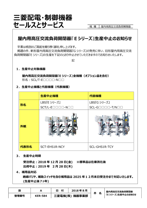 掲題の件、新形屋内用高圧交流負荷開閉器『Gシリーズ』の発売に伴い、旧形屋内用高圧電流負荷開閉器『Eシリーズ』の生産を下記のとおり中止させていただきますのでお知らせいたします。 1.生産中止対象機器 屋内用高圧交流負荷開閉器『Eシリーズ』全機種(...