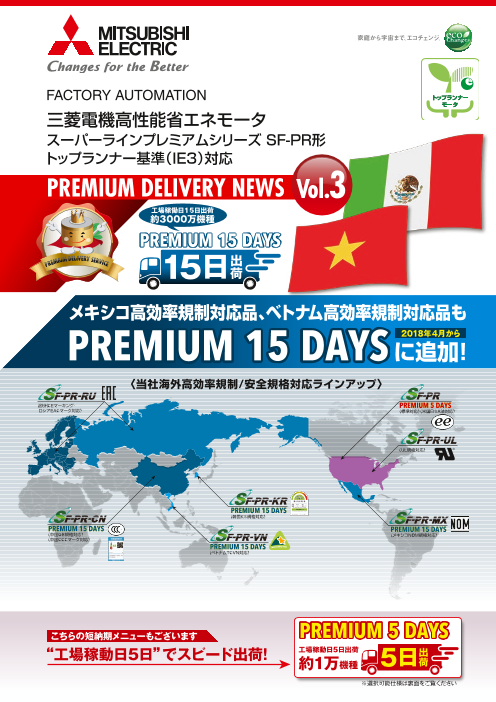 当社海外高効率規制/安全規格対応ラインアップ メキシコ高効率規制対応品、ベトナム高効率規制対応品もPREMIUM 15 DAYSに追加されました。 ◆PREMIUM 5 DAY 工場稼動日5日で出荷します! ◆PREMIUM 15 DAYS...