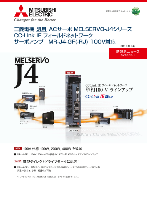 ◆100V 仕様 100W, 200W, 400W を追加 MR-J4-GFは、100V/200V/400V仕様 0.1 kW~22 kWのサーボアンプをラインアップ ◆薄型ダイレクトドライブモータに対応 MR-J4-GFは、薄型ダイレクトド...