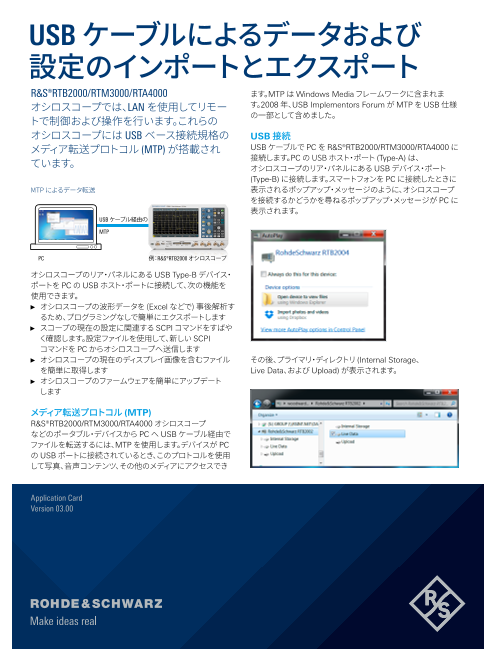 R&S RTB2000/RTM3000/RTA4000 オシロスコープでは、LANを使用してリモートで制御および操作を行います。これらのオシロスコープにはUSBベース接続規格のメディア転送プロトコル (MTP) が搭載されています。 オシロスコープ...