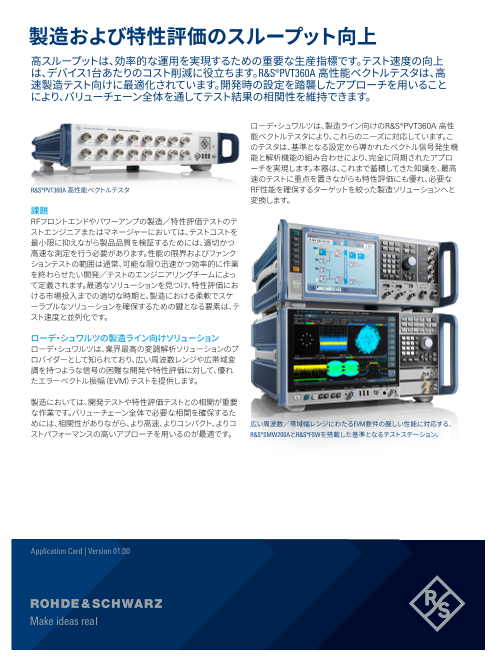高スループットは、効率的な運用を実現するための重要な生産指標です。テスト速度の向上は、デバイス1台あたりのコスト削減に役立ちます。R&S®PVT360A 高性能ベクトルテスタは、高速製造テスト向けに最適化されています。開発時の設定を踏襲したアプローチを用...