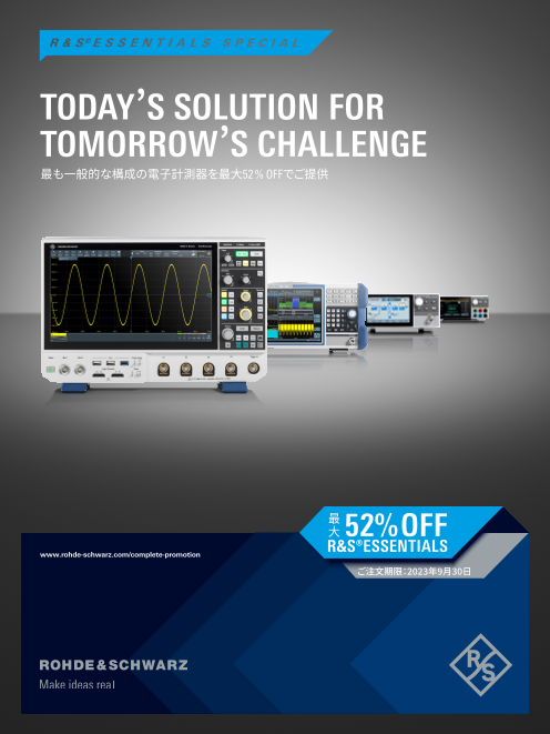 ローデ・シュワルツは、最も一般的な構成の電子計測器を最大52 % OFFでご提供します。今回のプロモーションオファーでは、最新のR&S MXO4シリーズ・オシロスコープからDC電源、スペクトラム/アンテナ・アナライザ、信号発生器、LCRメータ、ソース・メ...