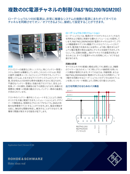 ローデ・シュワルツのDC電源は、非常に複雑なシステムの複数の電源にまたがってすべての チャネルを同期させてオン/オフできるように、接続して設定することができます。 ※詳しくはPDF資料をご覧いただくか、お気軽にお問い合わせ下さい。
