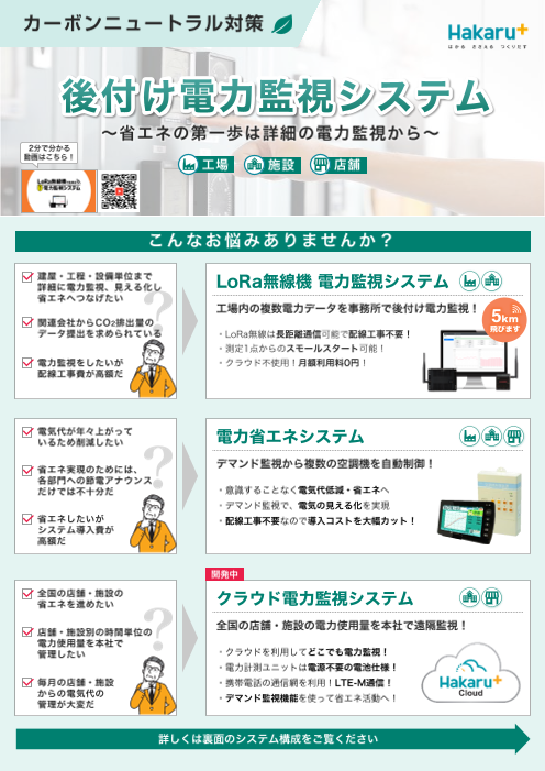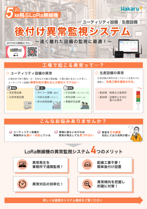 ハカルプラスのLoRa無線機HLRシリーズの一覧と導入シーンを掲載しています。 通信確認ができるキットの貸出サービスもあります。下記URLからお問い合わせください。 https://energy-measuring.jp/solution-lora/