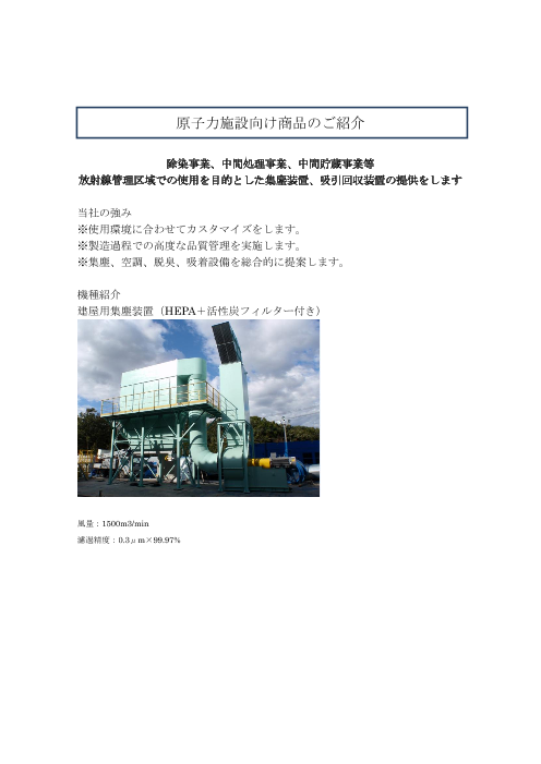 当社では、放射線管理区域などの原子力施設向けに、 高精度かつ安全な集塵・吸引回収装置の提供を行っています。 装置はすべて、使用環境に合わせてカスタマイズを実施しているほか、 集塵・空調・脱臭・吸着設備まで、包括的なご提案が可能です。 また、製...