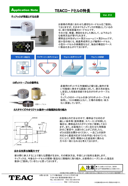 お客様の用途に合わせた適切なロードセルをご提供しておりますが、その中でもティアックが得意としているのは、超小型低容量のロードセルです。 その小型、軽量、薄型を生かした例として、以下のような使用方法が挙げられます。 標準品は外形がφ10×高さ3mm~φ...