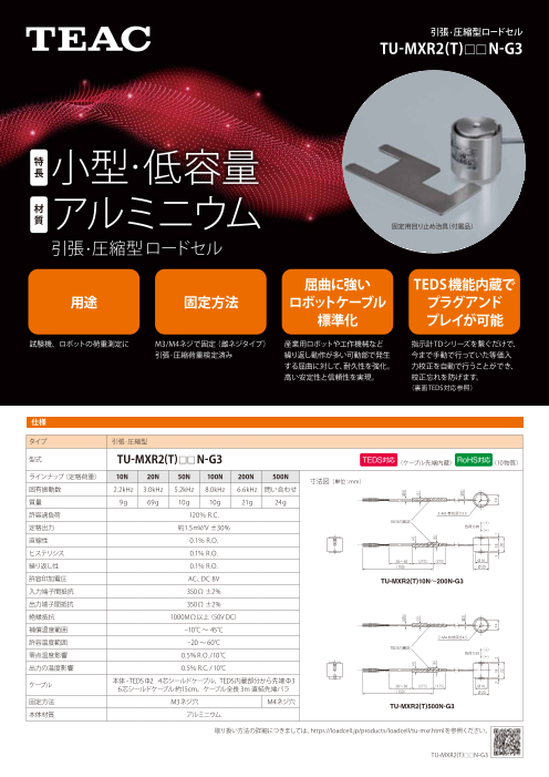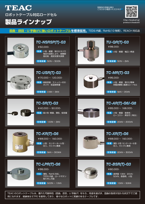 生産現場でケーブルの断線にお困りの方 ロボットハンドやボンディング装置などの、動きのある現場でロードセルをお使いの方 TEACのロードセルは、屈曲・捻回・U字曲げに強いロボットケーブルを採用しています。 TEDS内蔵。RoHs,UL対応品です。