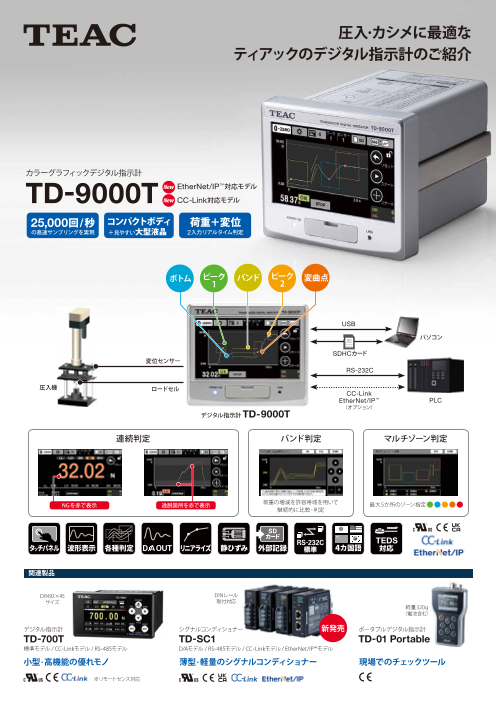 EtherNet/IP対応(オプション) 25,000回/秒の 高速サンプリングを実現 コンパクトボディ+見やすい大型液晶で荷重も変位もリアルタイムに捕捉する TD-9000Tは、荷重(ロードセル)とストローク(変位計)の2入力に対応した荷重管理...