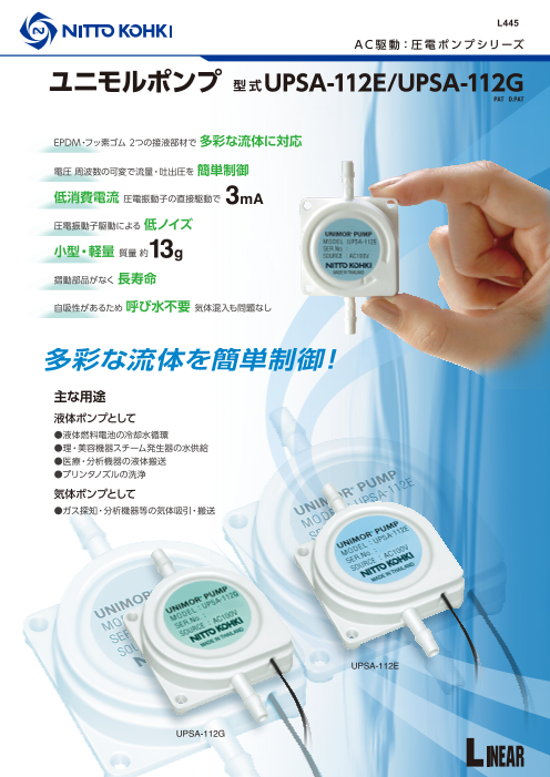 「ユニモルポンプ UPSA-112E/UPSA-112G」は、EPDM・フッ素ゴムの2つの接液部材で 多彩な流体に対応したユニモルポンプです。 圧電振動子駆動による低ノイズで、摺動部品がなく長寿命。 電圧、周波数の可変で、流量・吐出圧を簡単に制...
