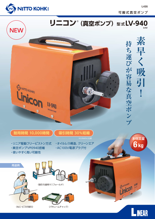 『リニコン LV-940』は、持ち運びが容易な真空ポンプです。 本体質量6kgで使いやすく高い可搬性。真空ポンプ「VP0940」を搭載し、 AC100Vの電源プラグを付属しています。 オイルレス構造、クリーンエアで、吸引ろ過用マニフォールド...