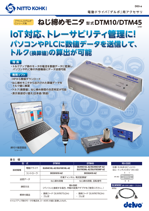 『DTM10/DTM45』は、当社が取り扱う「ブラシレスデルボCシリーズ」用のねじ締めモニタです。 トルクアップ時のモータの電流をトルク値に換算し、 出力トルク(換算値)、ねじ締め時間の合否判定が可能。 パソコンやPLC(シーケンサ)等の外部機...