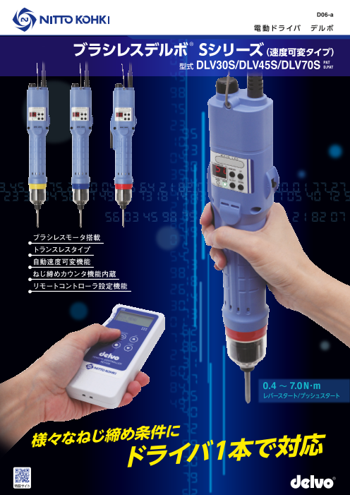 『ブラシレスデルボSシリーズDLV30S/45S/70S』は、ブラシレスモータを搭載した 速度可変タイプの電動ドライバです。 回転速度レベルは9段階調整可能。 ワイドな仕様範囲で様々なねじ締め条件に対応します。 また、ねじ締め本数設定、ねじ締...