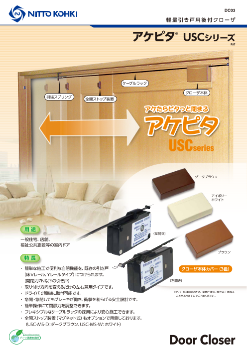 「アケピタ」は軽量引き戸用後付けクローザです。 簡単な施工で便利な自閉機能を、既存の引き戸(床Vレール、Yレールタイプ)につけられます。 (開閉力7N以下の引き戸) 取付方向を変えるだけの左右兼用タイプです。 【セット内容】 ■クローザ本体...