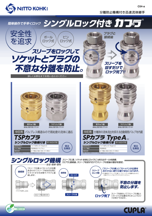 「シングルロック付きカプラ」は、スリーブをロックしてソケットとプラグの不意な分離を防止する 迅速流体継手です。 スリーブに溝、ソケット本体にロックピンまたはボールを装備しており、 「カプラ」接続後、スリーブを回すだけでスリーブの前後の動きを固定...