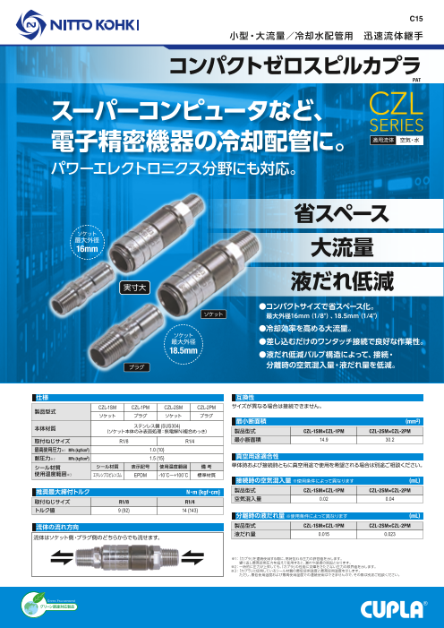 『CZLシリーズ』は、小型・大流量/冷却水配管用の迅速流体継手です。 スーパーコンピュータなど、電子精密機器の冷却配管に適しており、 パワーエレクトロニクス分野にも対応。 小ピッチでの配管が可能なため、配管の省スペース化に活用できるほか、 コ...