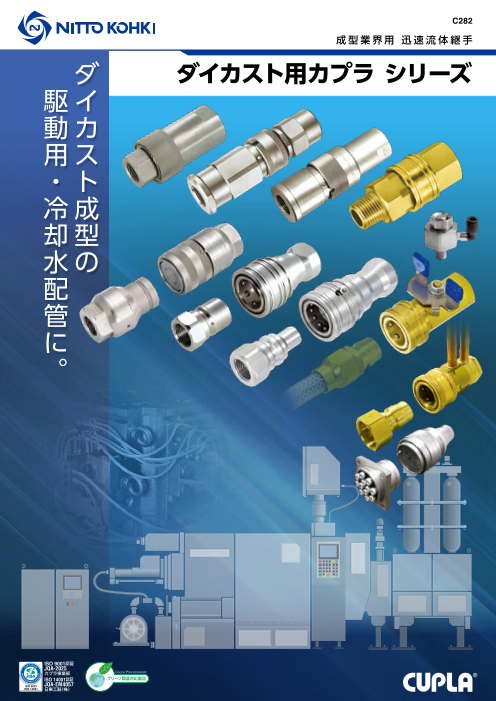 当カタログは、当社が取り扱う、成型業界用の迅速流体継手『ダイカスト用カプラシリーズ』を ご紹介しています。 型締め・型開き時の中子駆動シリンダ用に適した「HSP-DCカプラ」や ハイサイクルを実現する冷却と金型交換の効率化に使用できる「SPカプ...