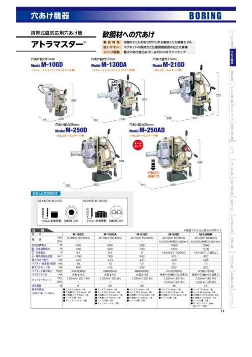 「アトラマスター M-250D」は市販のツイストドリルを取り付けられる 携帯式磁気応用穴あけ機です。 マグネットの保持力と位置調整範囲の広さを兼備し、パワフルな穴あけをサポートします。 【標準付属品】(刃物は付属していません) ・スパナ7×8...