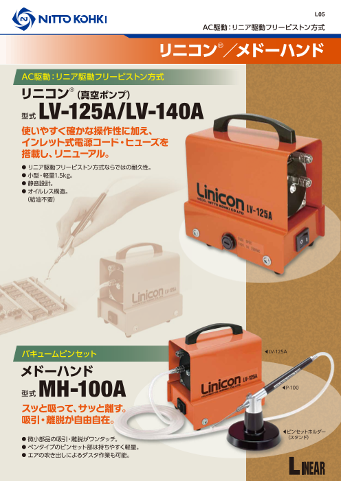 『LV-125A/LV-140A』は、リニア駆動フリーピストン方式のリニコン(真空ポンプ)です。 1.5kgと小型・軽量で、静音設計。給油不要のオイルレス構造となっております。 この他に、吸引・離脱が自由自在のメドーハンド「MH-100A」も取り...