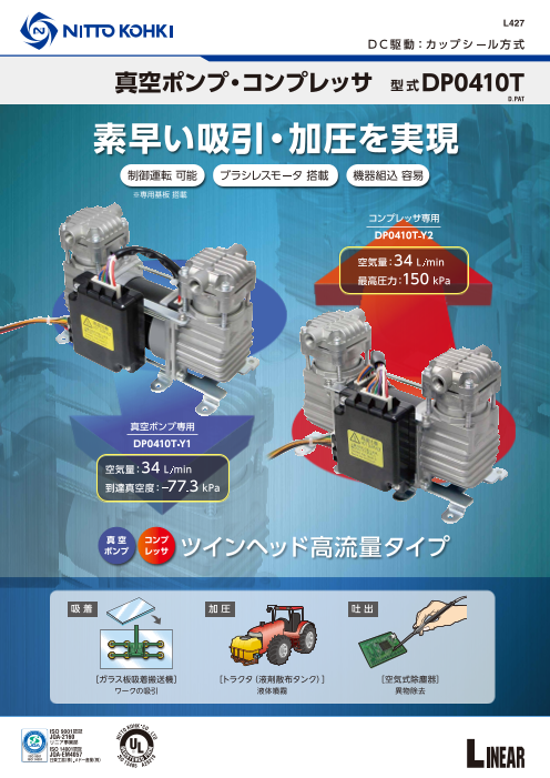 『DP0410T』は、ツインヘッド交流量タイプの真空ポンプ・コンプレッサです。 ブラシレスモータを搭載し、制御運転が可能。機器組込みが容易にできます。 また当社では、真空ポンプ専用「DP0410T-TY」と、 コンプレッサ専用の「DP0410T...