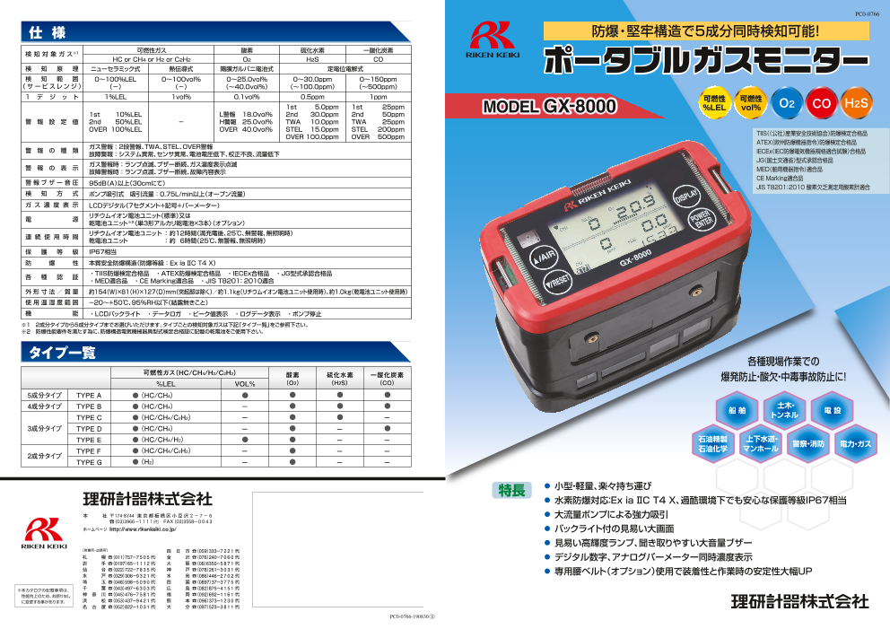 〇 センサ2年保証 〇 防塵・防水構造(保護等級:IP67相当) 〇 約20,000時間の連続使用が可能 〇 リモートケーブルを使用した作業前測定と作業者の周囲の 安全を確認するリアルタイム測定の両方に対応 〇 本質安全防爆構造 〇 JI...