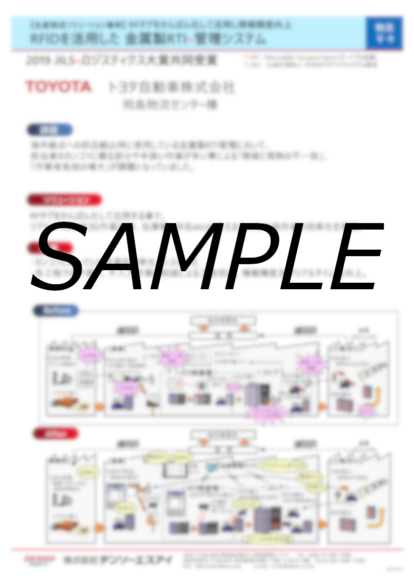 【導入事例】 企業名:トヨタ自動車株式会社 飛島物流センター 様 【課題】 海外拠点への部品輸出時に使用している金属製RTI管理において、 担当者のカンコツに頼る部分や手扱い作業が多い事による 「情報と現物の不一致」「作業者負担の増大」が課...