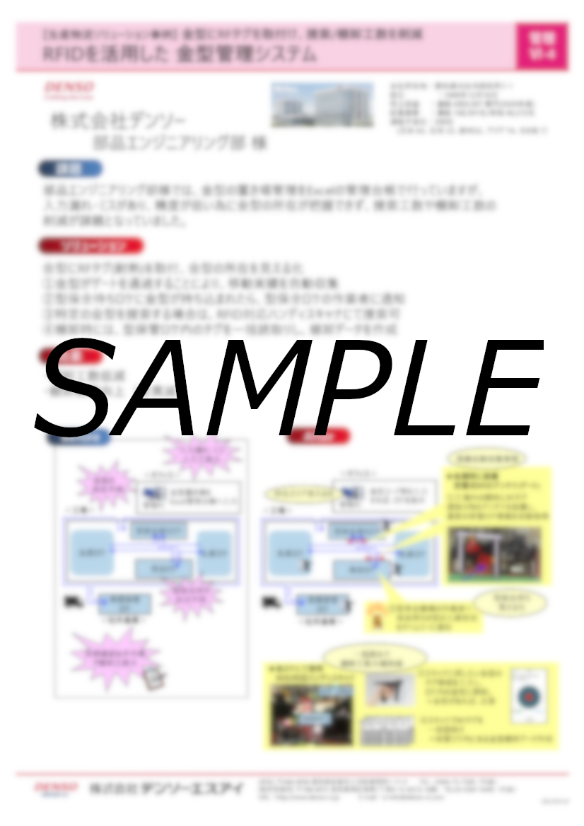 【導入事例】 企業名:株式会社デンソー 部品加工開発部 様 【課題】 部品加工開発部様では、金型の置き場管理をExcelの管理台帳で行っていますが、 入力漏れ・ミスがあり、精度が低い為に金型の所在が把握できず、捜索工数や棚卸工数の 削減が課...