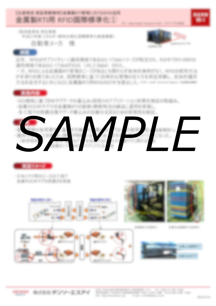 【実証実験事例】 某 自動車メーカ様 【概要】 近年、 RFIDのサプライチェーン適用規格であるISO 1736Xシリーズが制定され、その中でRTI のRFID適用規格であるISO 17364がJIS化(JIS Z 0664)された...