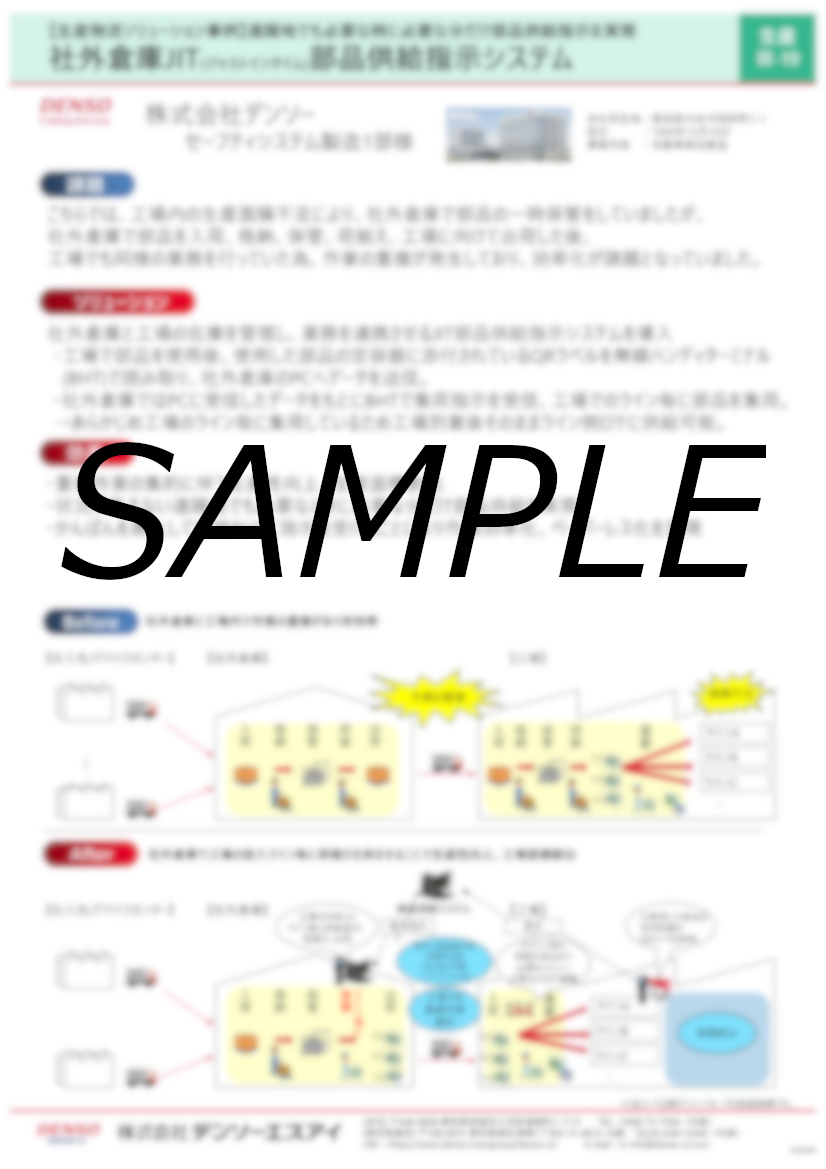 【導入事例】 企業名:株式会社デンソー様 【課題】 工場内の生産面積不足により、社外倉庫で部品の一時保管をしていましたが、 社外倉庫で部品を入荷、格納、保管、荷揃え、工場に向けて出荷した後、 工場でも同様の業務を行っていた為、作業の重複が発...