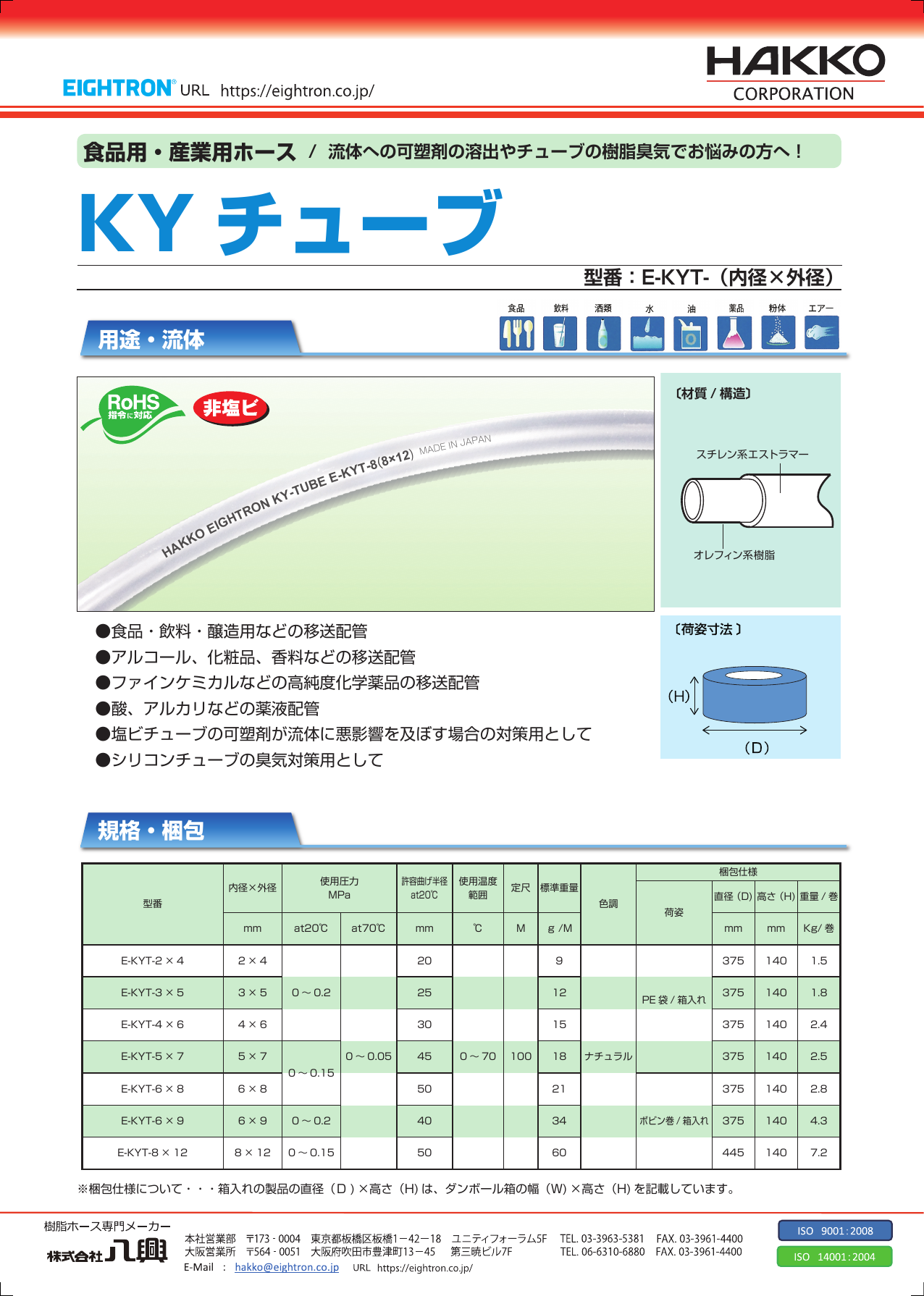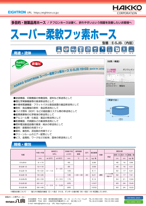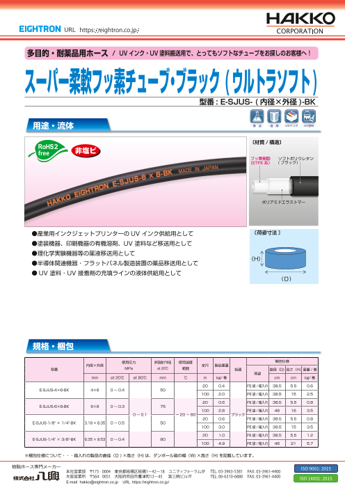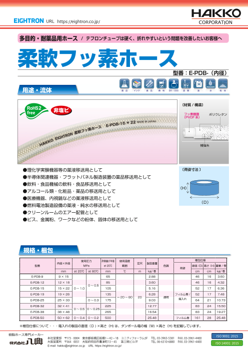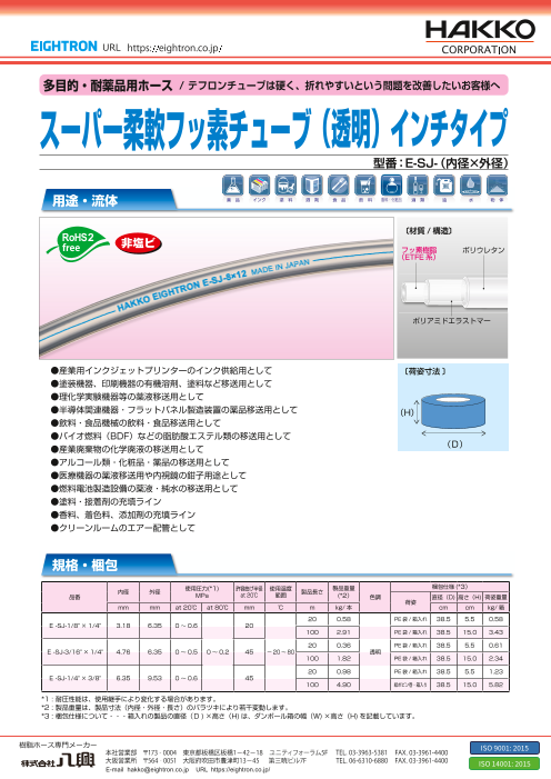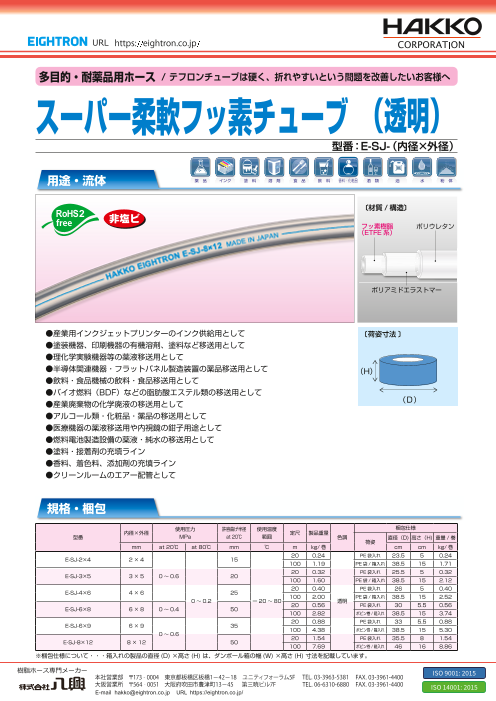 透明性と耐薬品性と柔軟性を有し、負圧で圧送でも使用できるため、幅広い用途で採用されています。 ●塗装機器、印刷機器の有機溶剤、塗料など移送用として ●理化学実験機器等の薬液移送用として ●半導体関連機器・フラットパネル製造装置の薬品移送用として ...