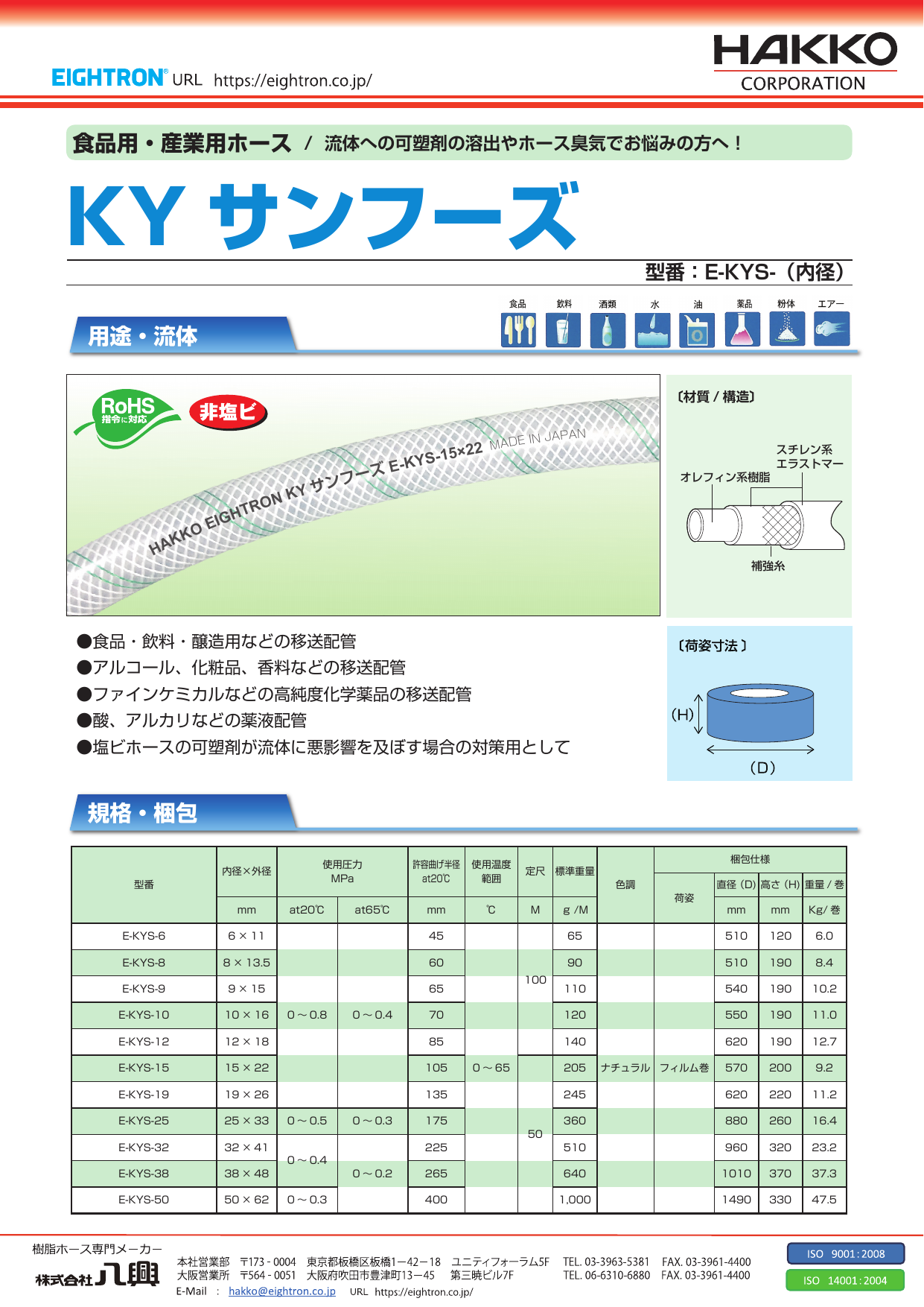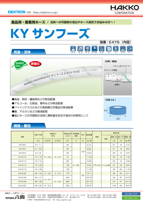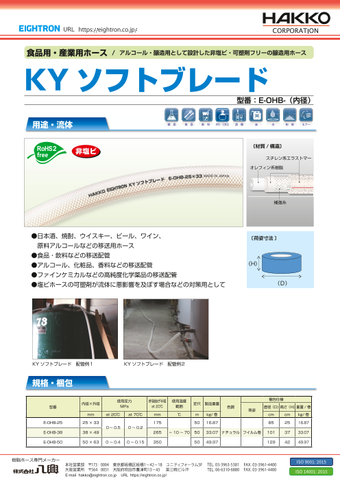 ホースに可塑剤を一切使用していないため、流体への溶出、樹脂臭気の移行が抑えられます。 環境にやさしい、非塩ビ素材で環境負荷低減に貢献できます。 ●食品・飲料・醸造用途として ●アルコール・化粧品・香料なのど移送用として ●ファインケミカルなどの高...